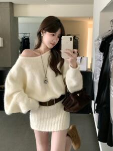 2025早秋新款法式露肩慵懒风毛衣连衣裙独特超好看显瘦收腰包臀裙