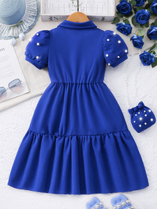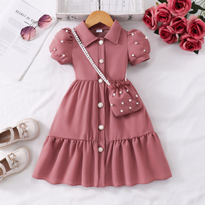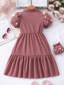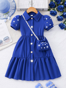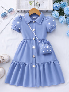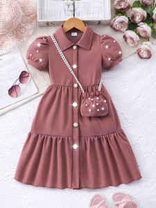 小童(女)连衣裙,珍珠袖纯色连衣裙+珍珠挎包
