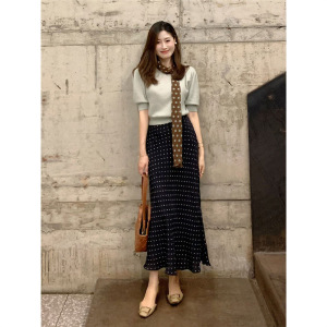 深圳南油早秋高级感巨好看独特漂亮小香风浅绿色波点半身裙套装女