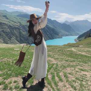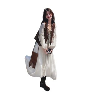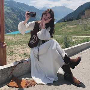 复古旅游穿搭游牧绣花马甲连衣裙套装女2025秋新款V领长裙两件套