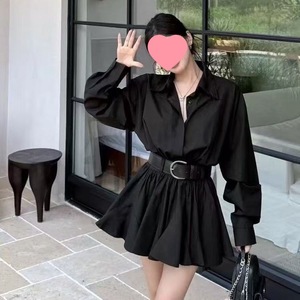 女装法式新款气质两件早秋拼接百褶腰带长袖短裙衬衫连衣裙带腰带