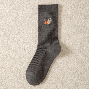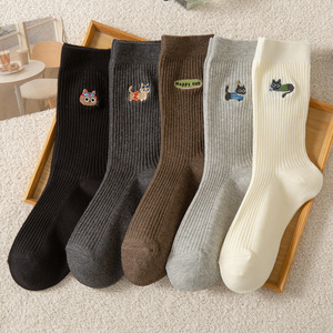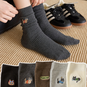 双针秋冬季新款女袜日系学生袜子竖条字母卡通刺绣简约中长筒棉袜
