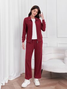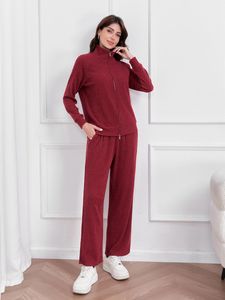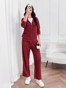 2025秋冬季欧美跨境亚马逊纯色翻领拉链针织休闲长袖宽松裤女套装