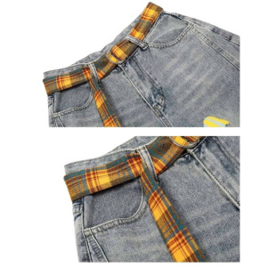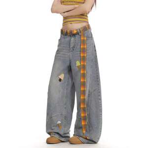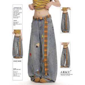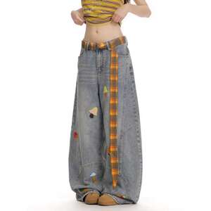 格纹腰带卡通刺绣设计感牛仔裤女2025夏季新款宽松阔腿拖地长裤子