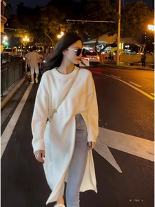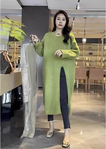 秋冬慵懒风圆领套头毛衣裙子女宽松过膝中长款侧边开叉针织连衣裙