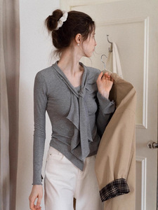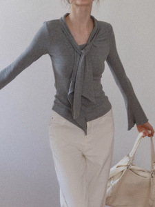 绑带v领喇叭袖长袖T恤早秋新款气质修身显瘦设计感温柔上衣