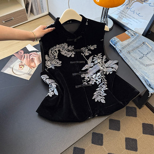 新中式轻国风春秋马甲背心女2025感黑色不规则刺绣丝绒上衣