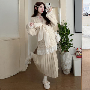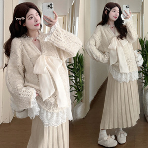 孕妇秋冬款法式蝴蝶结v领气质款蕾丝毛衣潮妈宽松甜美显瘦针织衫