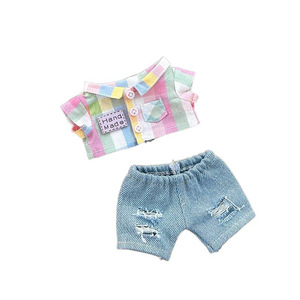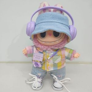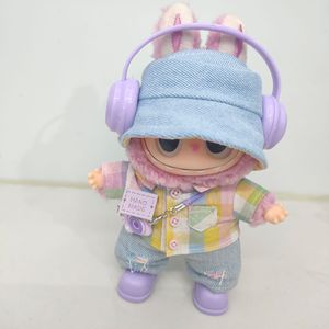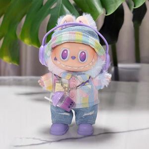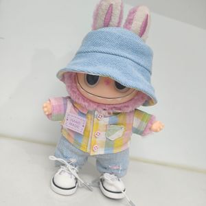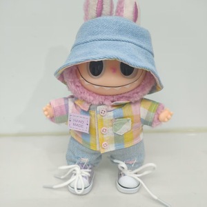 一二三代Labubu娃衣彩虹格子套装拉布布紫色衬衫破洞牛仔裤渔夫帽