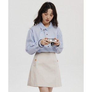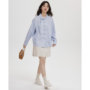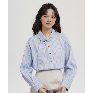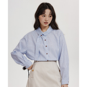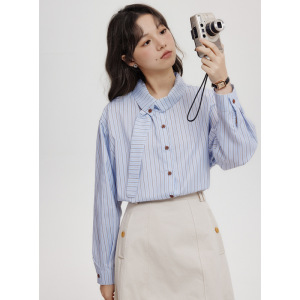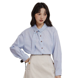 御姐风淑女气质设计感飘带领蓝色条纹衬衫女长袖宽松百搭显瘦上衣