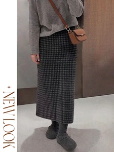 格子毛呢直筒半身裙2025秋冬新款韩版高腰加厚针织开叉包臀一步裙
