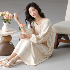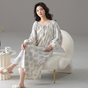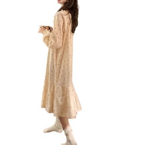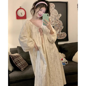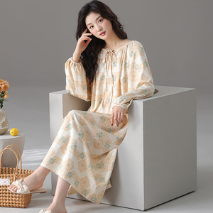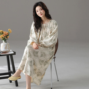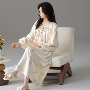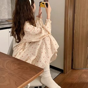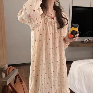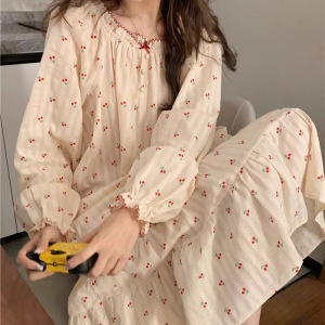 睡裙女春秋季泡泡袖长袖套装甜梦小樱桃中长款撞色睡衣秋天家居服