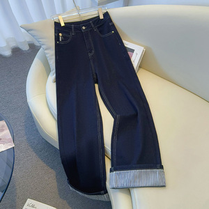 丹宁蓝牛仔裤女秋季2025新款秋冬流行穿搭卷边窄版直筒宽松阔腿裤