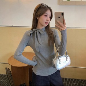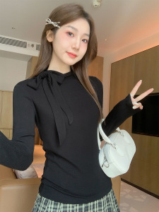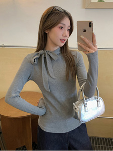 别致蝴蝶结灰色纯欲半高领打底衫T恤女秋季韩系修身内搭长袖上衣
