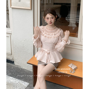 早秋新款温柔风气质甜美花边蕾丝长袖女绑带收腰衬衫撞色半裙套装