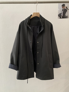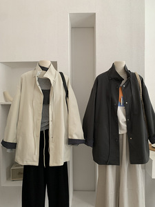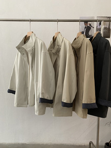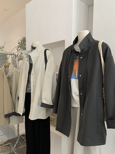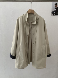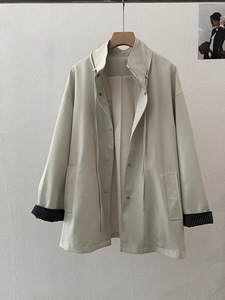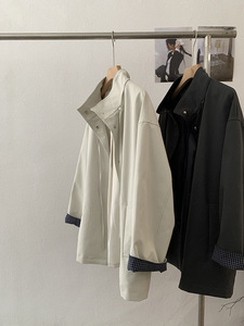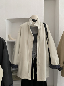 欧玛莱 立领中长款风衣宽松外套百搭秋季韩系拼接格子长袖女 4715