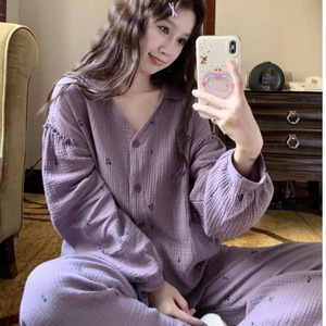 韩系复古紫色碎花云朵棉睡衣女春秋V领长袖长裤网红风家居服套装