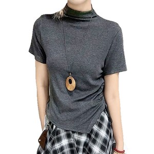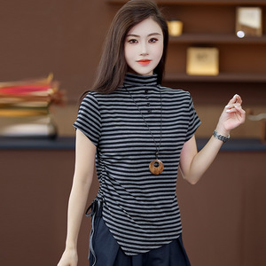 2025早秋新款休闲洋气半高领韩版百搭不规则条纹短袖T恤女打底衫