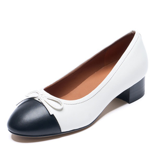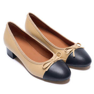 经典小香风拼色蝴蝶结圆头浅口粗跟单鞋女通勤羊皮舒适百搭工作鞋
