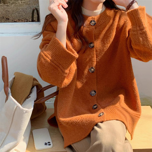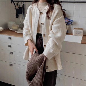 米白复古设计感纯色毛衣开衫女秋冬新款宽松中长款针织外套百搭