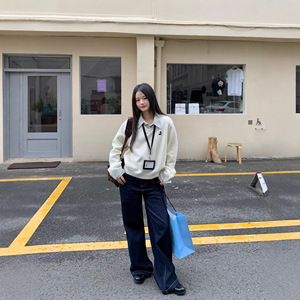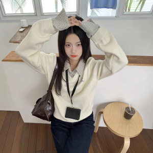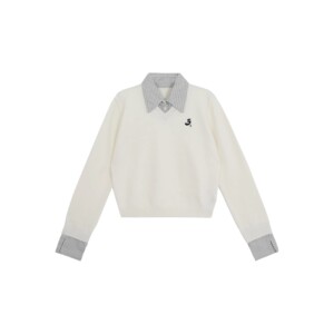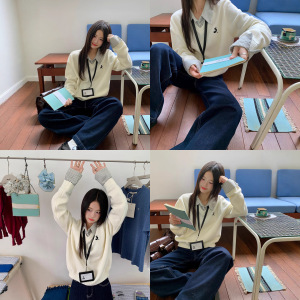 小仙倪子学院风格纹假两件毛织女圆领刺绣针织休闲慵懒感外套上衣