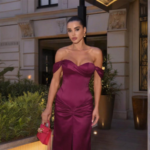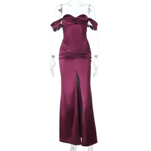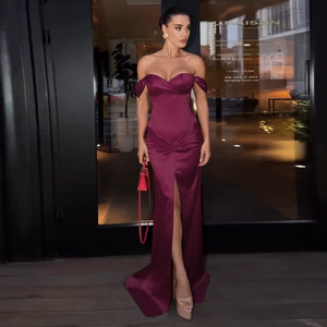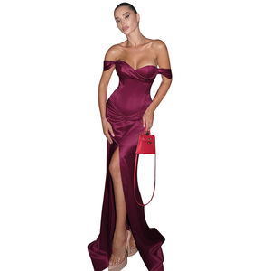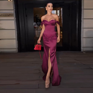 YL25355 欧美风跨境2025秋新款一字肩开叉缎面气质名媛宴会晚礼服