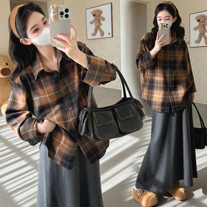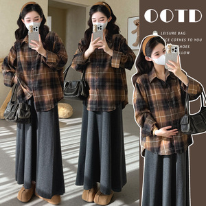 现货孕妇套装秋冬新款加厚磨毛格子衬衫 针织半身裙两件套套装