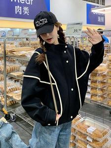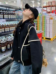 黑色设计感棒球服女慵懒风2025春秋新款韩版宽松流行撞色条纹外套