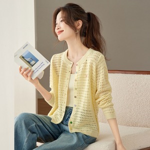 2025早秋新款镂空百搭彩虹扣针织开衫女圆领蝴蝶结长袖毛衣短外套