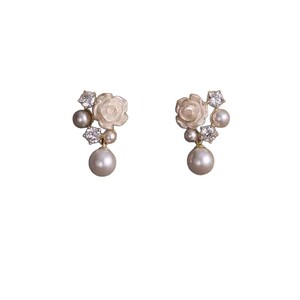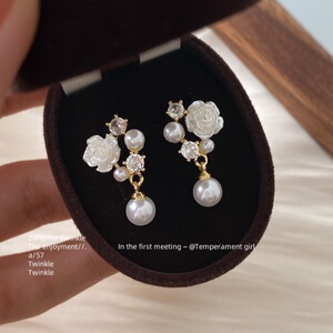 法式白色花朵耳钉女小巧珍珠耳环s925银针耳饰蚊香盘耳夹无耳洞