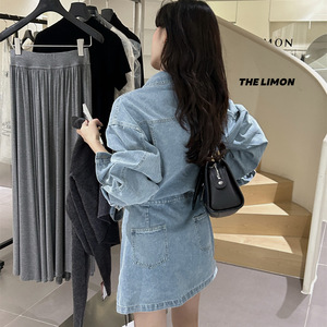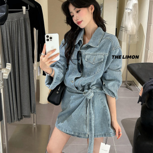 【柠檬绿茶】1113复古不规则设计感收腰系带牛仔连衣裙