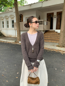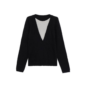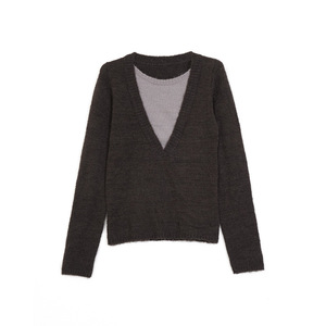 万为 老钱风毛织上衣女2025秋季新款撞色拼接V领假两件针织衫6083