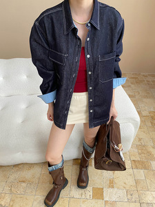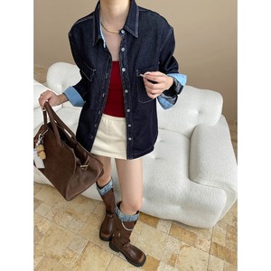 司南 明线外缝设计 美式复古撞色翻领双口袋宽松牛仔外套 SN8028