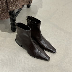 小众复古粗跟尖头棕色瘦瘦靴短靴女2025新款春秋季单靴法式小踝靴