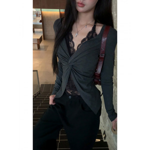 法式纯欲风蕾丝拼接纽结长袖t恤女早秋收腰显瘦假两件打底衫上衣