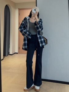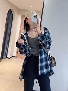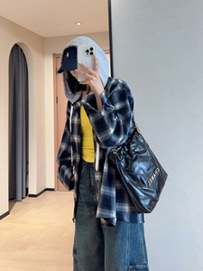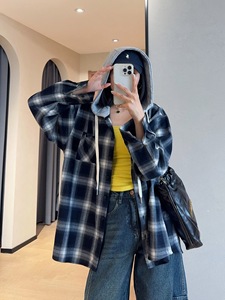 朵妮 时髦复古宽松显瘦休闲加厚假两件连帽格纹衬衫外套2025秋
