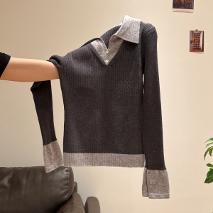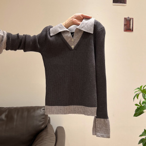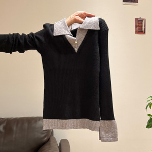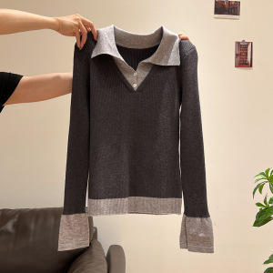 法式领长袖针织衫女2025春季新款撞色打底衫内搭修身显瘦上衣