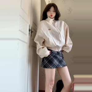 新款美式复古格子双面穿翻领绣花夹克女2025秋新款设计感撞侣雀珉