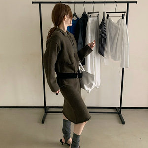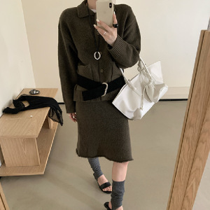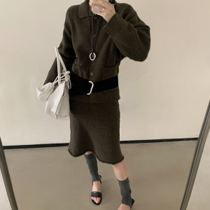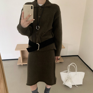 韩国东大门2025秋冬新款复古气质翻领针织开衫中长款半身裙套装女