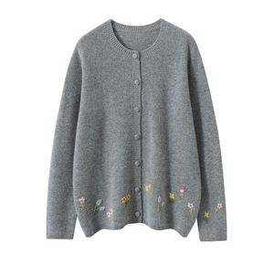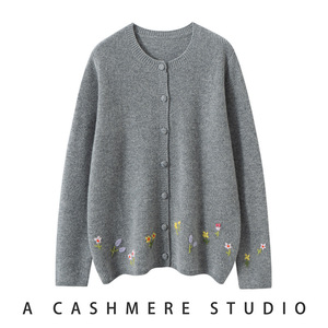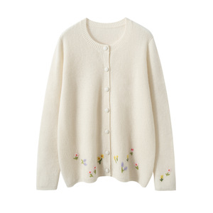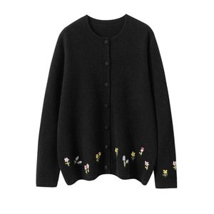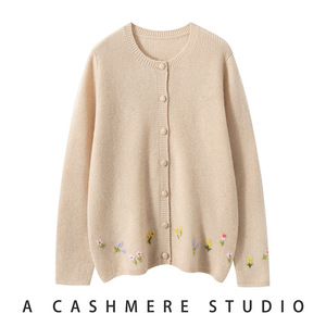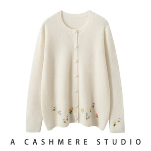 山羊绒衫女厚款圆领开衫手工钩花元宝针毛衣外套秋冬新款针织长袖