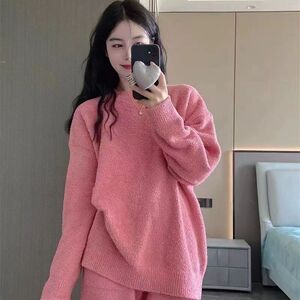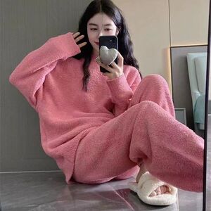 半边绒粉色加厚睡衣套装女2025秋冬季加绒毛绒针织家居服可外穿