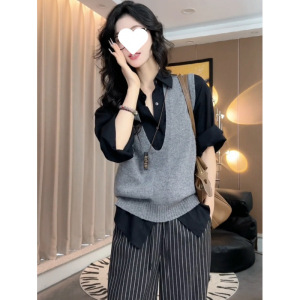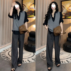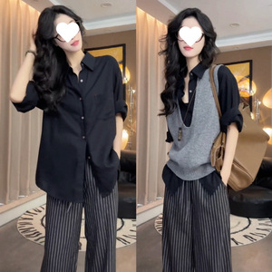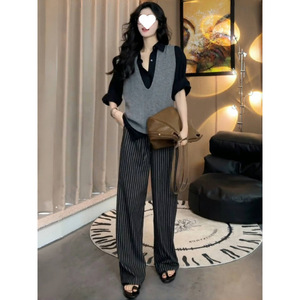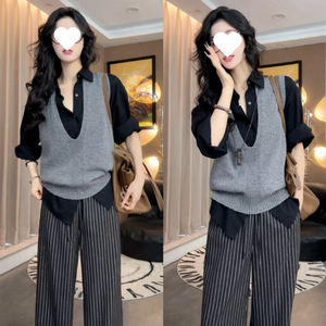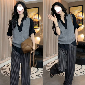 一整套开春穿搭2025年新款针织马甲衬衫条纹阔腿裤时尚休闲三件套