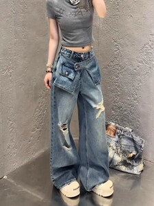 复古假两件高腰破洞阔腿牛仔裤女秋季新款宽松显瘦直筒休闲拖地裤
