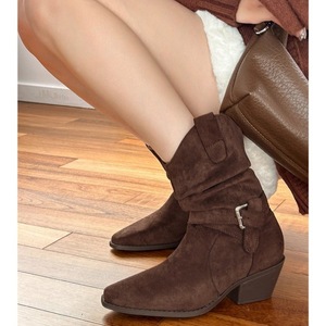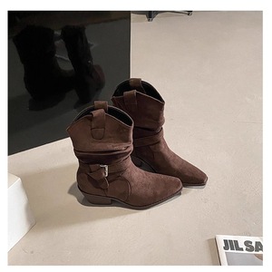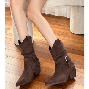 现货~磨砂绒面西部牛仔靴女V口粗跟堆堆靴皮带扣方头高跟马丁靴女