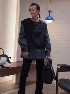 高端韩版设计感假两件衬衫女25秋新条纹拼接开衫宽松显瘦百搭上衣