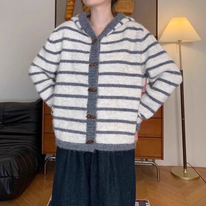 跨境亚马逊2025复古条纹连帽开衫圆领撞色长袖休闲宽松针织毛衣潮