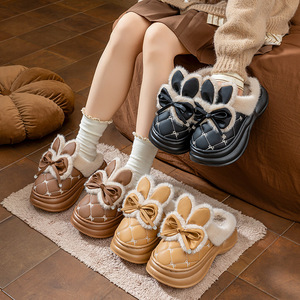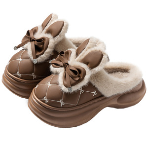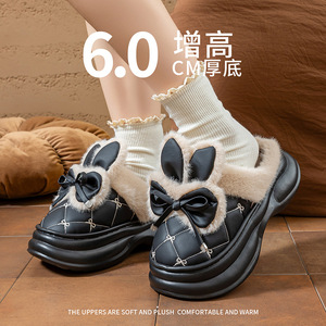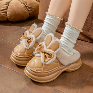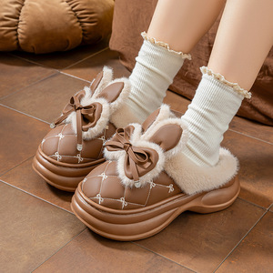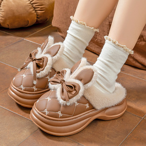 厚底高跟棉拖鞋女新款家居用蝴蝶结PU皮拖鞋冬季保暖防滑外穿增高