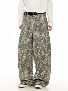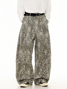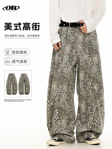 OREETA 豹纹阔腿弯刀裤男女款潮牌高街宽松高腰显瘦拖地baggy裤子
