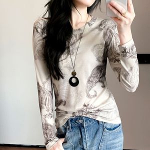 网纱打底衫女2025秋冬新款复古印花上衣修身显瘦长袖t恤小衫