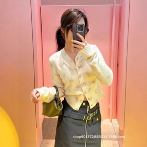 高版本早秋新款丹麦小众设计V领针织印花水钻纽扣开衫毛衣外套